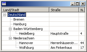 package com.sowas.swtdemo; import org.eclipse.swt.*; import org.eclipse.swt.widgets.*; import org.eclipse.swt.layout.*; public class ColumnTree{ public static void main(String[] args) { Display display = new Display(); final Shell shell = new Shell(display); shell.setLayout(new FillLayout()); Tree tree = new Tree(shell, SWT.BORDER | SWT.H_SCROLL | SWT.V_SCROLL); tree.setHeaderVisible(true); tree.setLinesVisible(true); TreeColumn column1 = new TreeColumn(tree, SWT.LEFT); column1.setAlignment(SWT.LEFT); column1.setText("Land/Stadt"); column1.setWidth(160); TreeColumn column2 = new TreeColumn(tree, SWT.RIGHT); column2.setAlignment(SWT.LEFT); column2.setText("Straße"); column2.setWidth(100); TreeColumn column3 = new TreeColumn(tree, SWT.RIGHT); column3.setAlignment(SWT.LEFT); column3.setText("Nr."); column3.setWidth(20); TreeItem item00 = new TreeItem(tree, SWT.NONE); item00.setText(new String[] { "Deutschland", "", ""}); TreeItem item01 = new TreeItem(item00, SWT.NONE); item01.setText(new String[] { "Bremen", "", ""}); TreeItem item02 = new TreeItem(item00, SWT.NONE); item02.setText(new String[] { "Hamburg", "", ""}); TreeItem item10 = new TreeItem(item00, SWT.NONE); item10.setText(new String[] { "Baden-Württemberg", "", ""}); TreeItem item11 = new TreeItem(item10, SWT.NONE); item11.setText(new String[] { "Heidelberg", "Hauptstraße", "4"}); TreeItem item20 = new TreeItem(item00, SWT.NONE); item20.setText(new String[] { "Niedersachsen", "", ""}); TreeItem item21 = new TreeItem(item20, SWT.NONE); item21.setText(new String[] { "Hannover", "Herrenhäuserstraße", "44"}); TreeItem item22 = new TreeItem(item20, SWT.NONE); item22.setText(new String[] { "Wolfsburg", "Am Finkenhaus", "16"}); shell.pack(); shell.open(); while (!shell.isDisposed()) { if (!display.readAndDispatch()) { display.sleep(); } } display.dispose(); } }